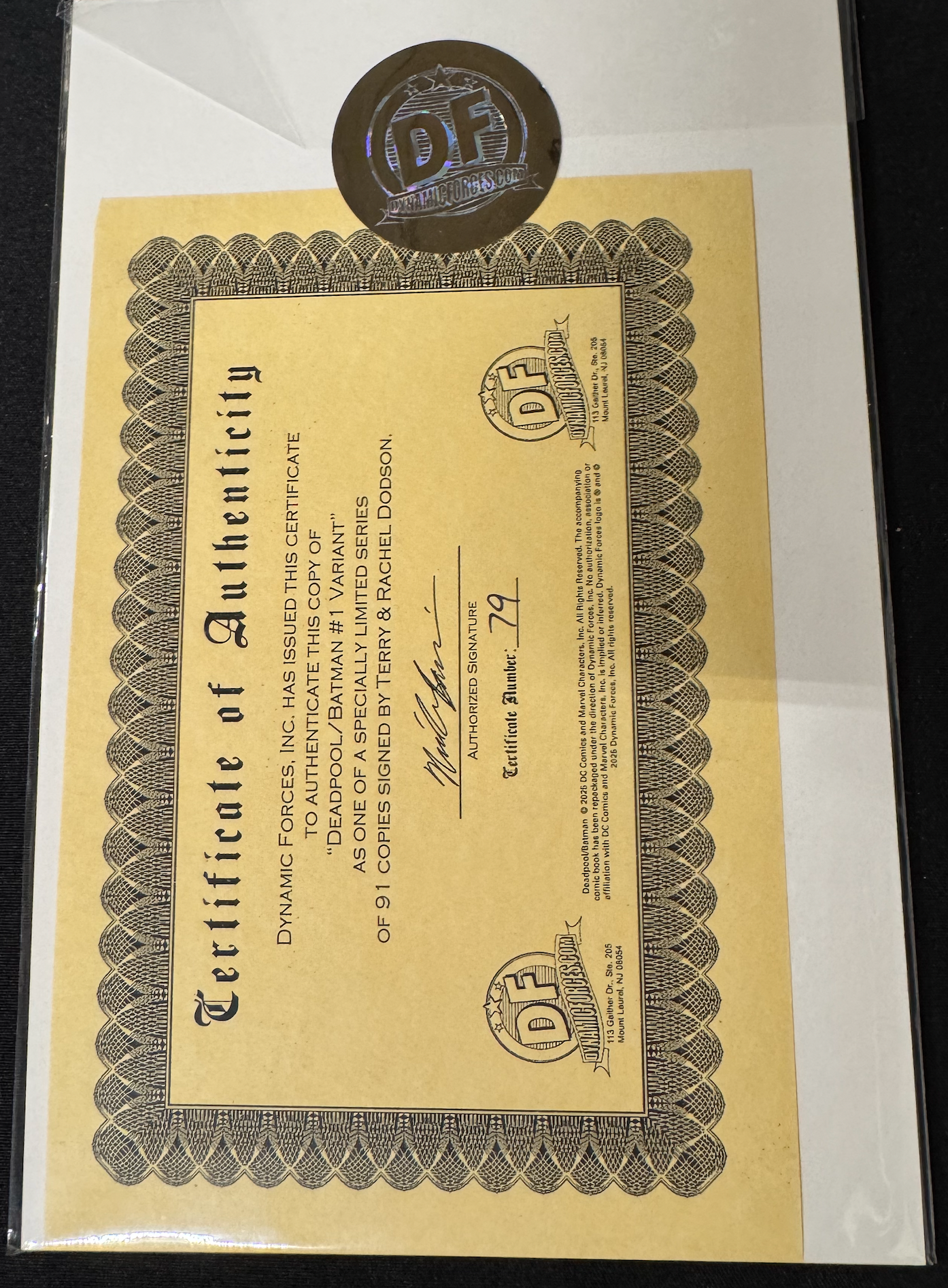 DEADPOOL/BATMAN #1 BLOOD RED SIGNATURE SERIES SIGNED BY TERRY AND RACHEL DODSON. Bagged/boarded with a Certificate of Authenticity and DF holofoil seal.